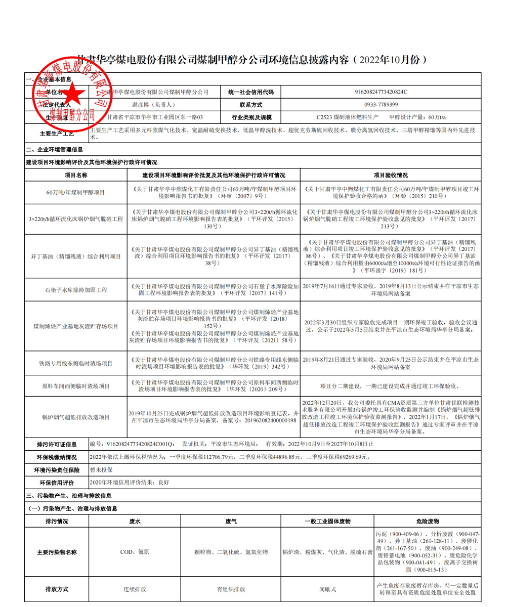煤制甲醇分公司環(huán)境信息公開(kāi)內(nèi)容(2022年10月)