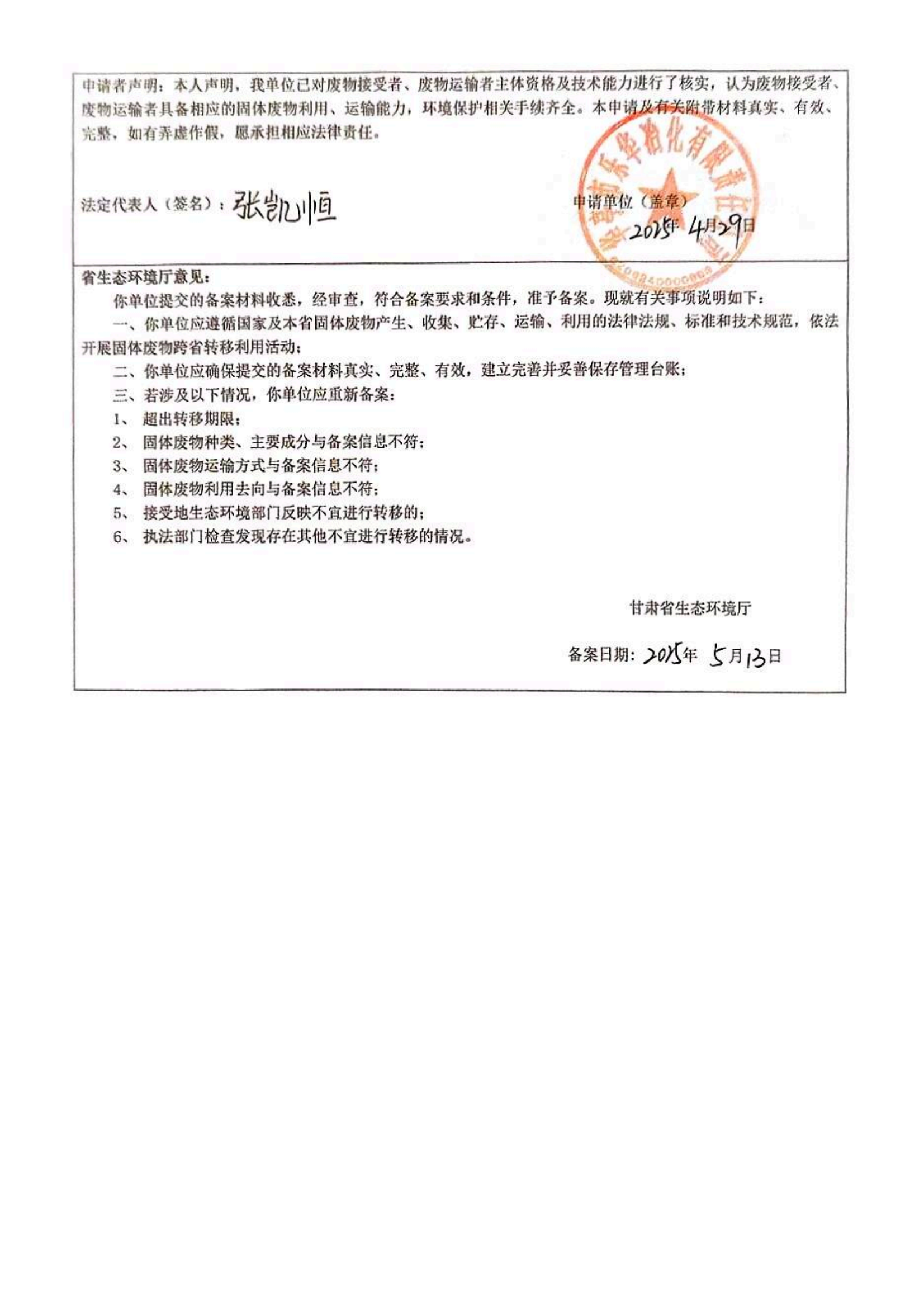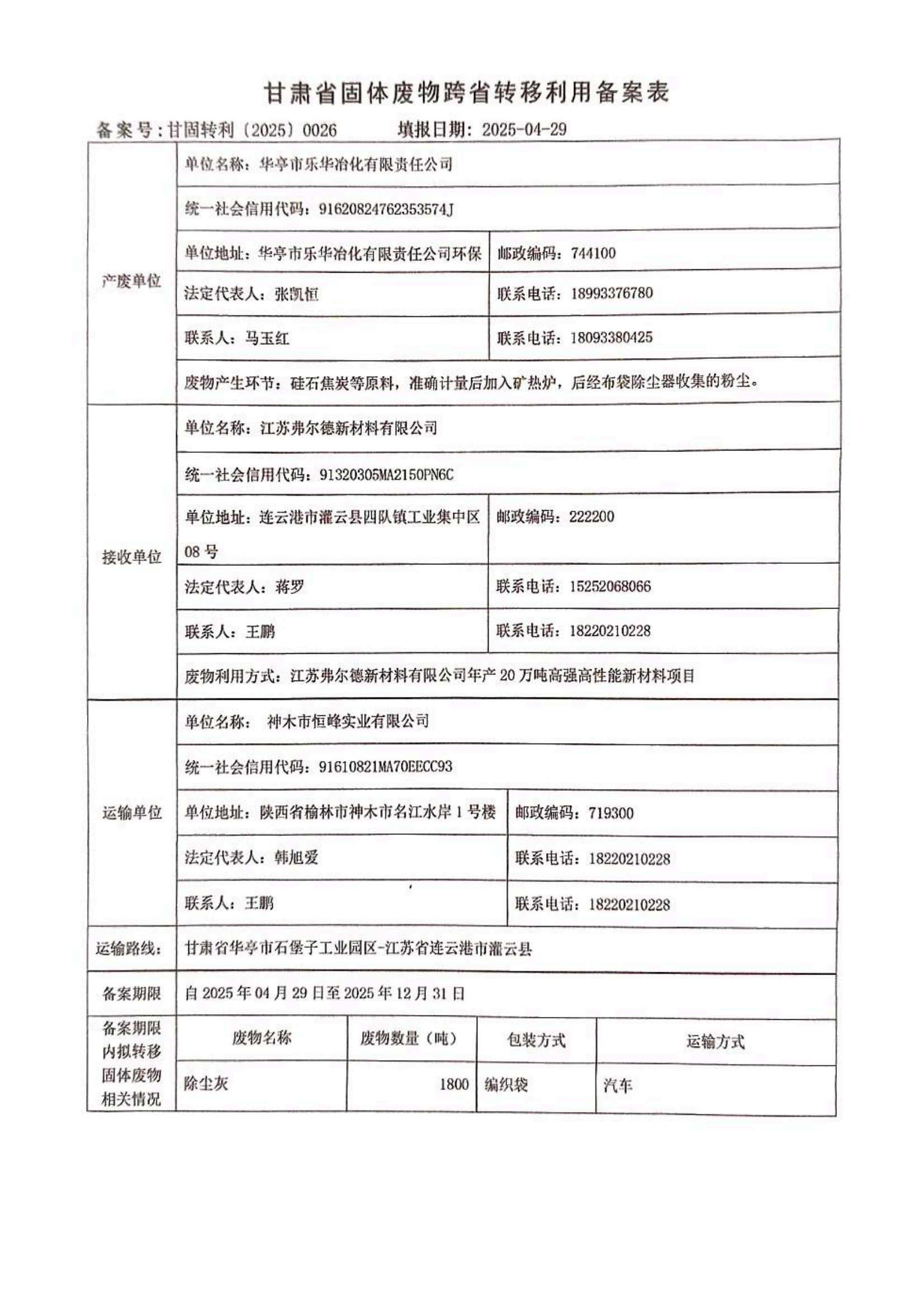 華亭市樂華冶化有限責任公司甘肅省固體廢物跨省轉移利用備案表